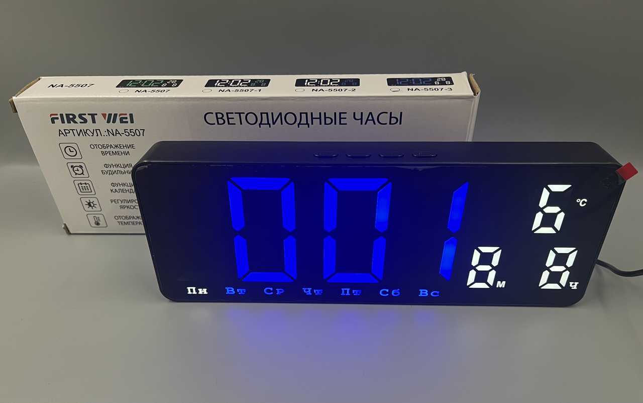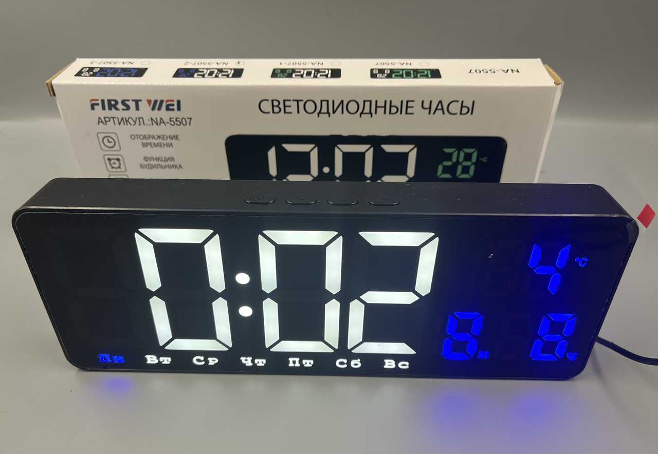 Часы+термометр+дата NA-5507-2 БЕЛо-Синие + ДНИ недели