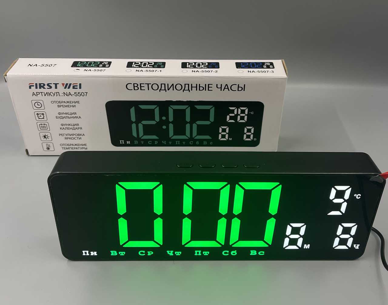 Часы+термометр+дата NA-5507 ЗЕЛено-Белые + ДНИ недели