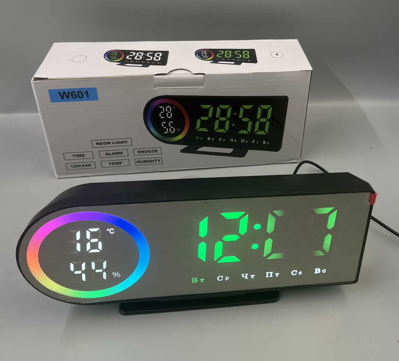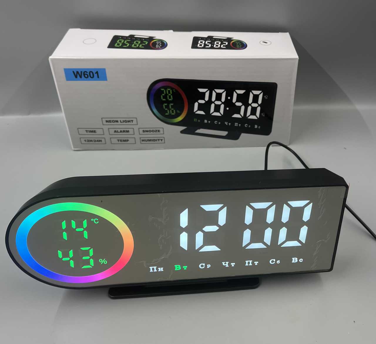 Часы+термометр+влажносмть W601-6 БЕЛая подсветка зеркальные ЗМАН