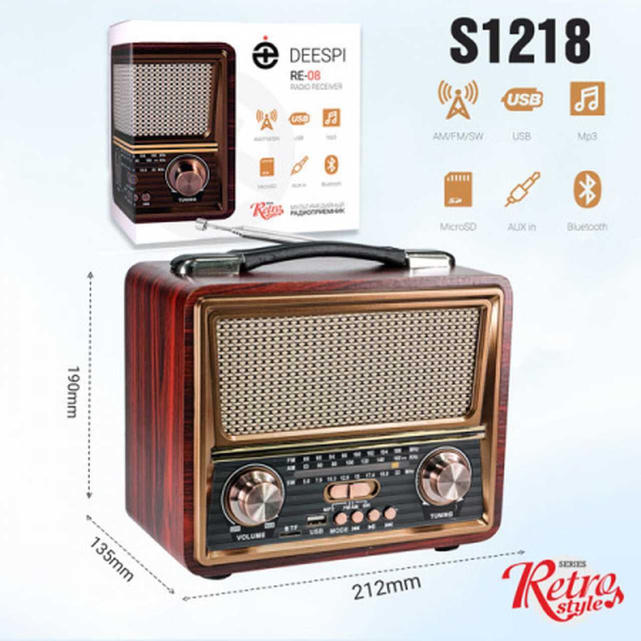 Радиоприемник Deespi RETRO RE-08_S1218 BT/AM/FM/SW/USB/AUX/MicroSD