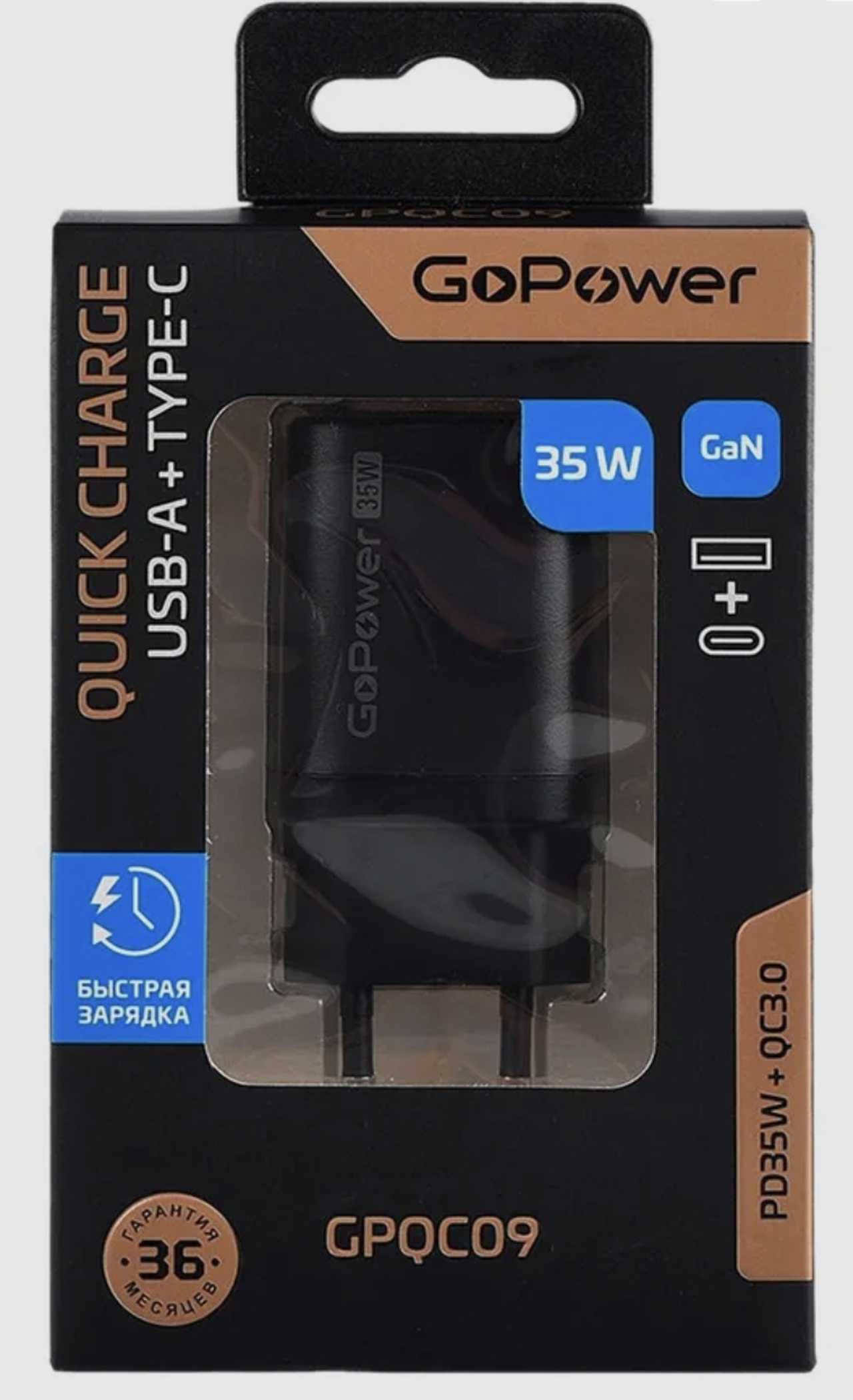 СЗУ 1+1 (1xUSB+1хPD type-c) GPQC09 GoPower 35W+QC3.0 GAN черный