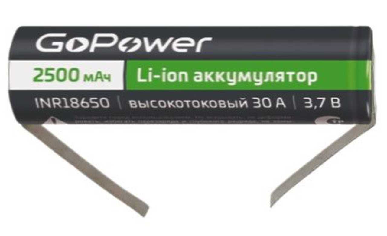 Аккумулятор 18650 + 2 вывода GoPower 2500мАh б/з 30A 3,7V Li-ion