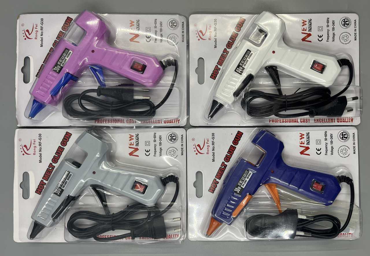 Термопистолет/клей-7,2мм 30 Вт с ВЫКЛ.+индикатор 24шт/уп Разные по 4 ЦВЕТА:роз,син,бел,сер