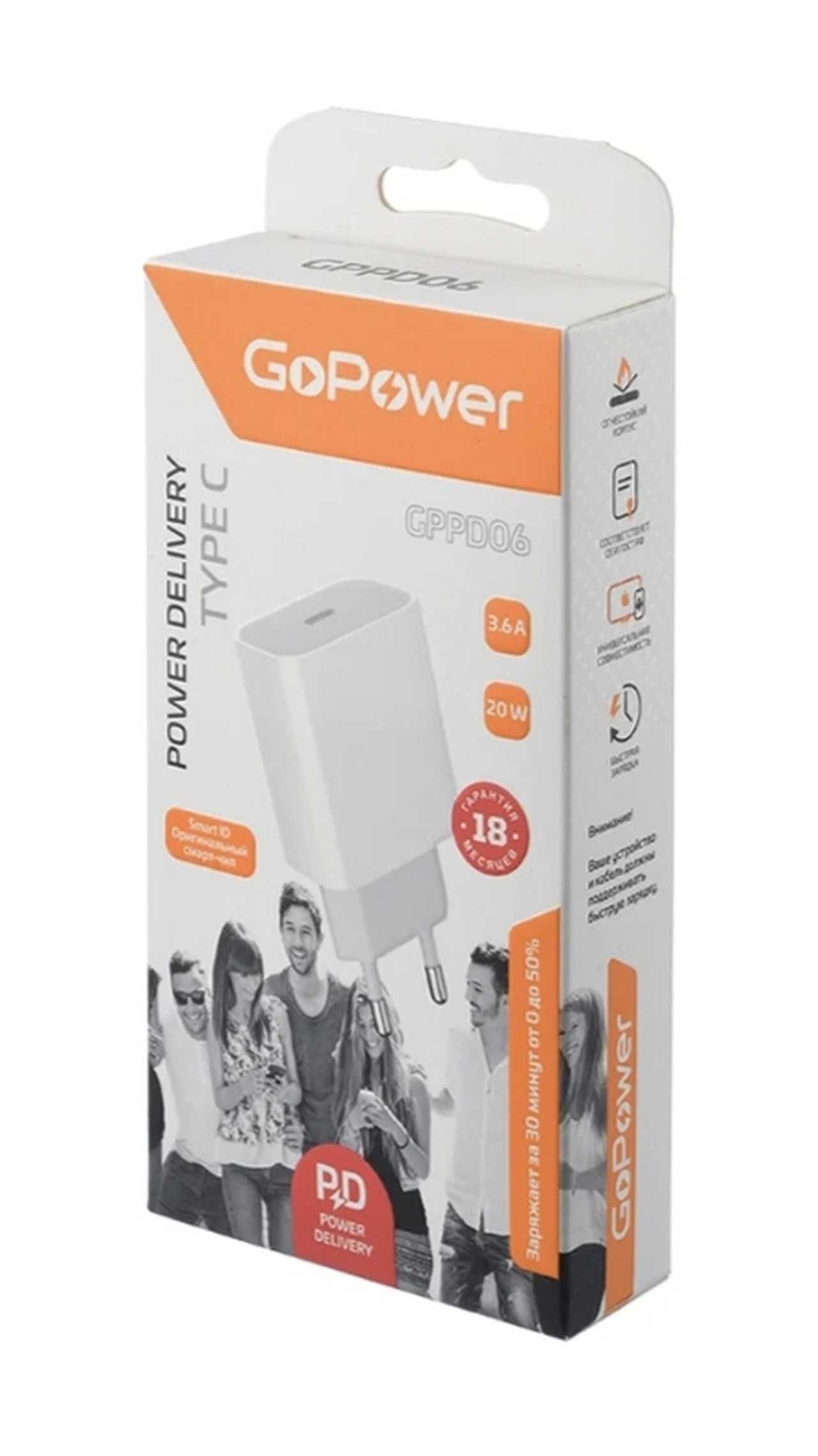 СЗУ 1хPD (type-c) USB-C 20W PD3.0 GoPower GPPD06 + шн. Type-C-C 100W ФОТО
