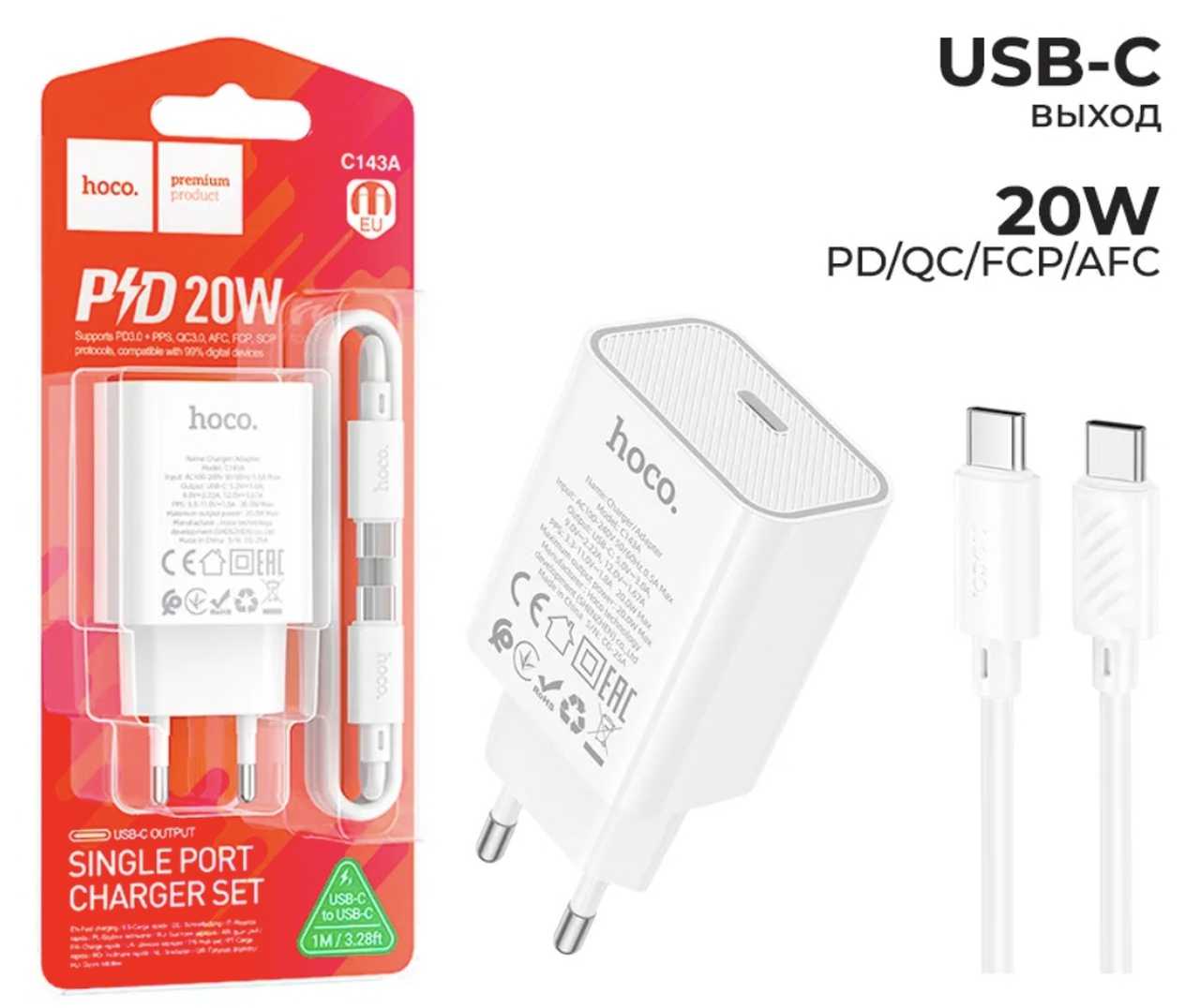 СЗУ 1хDP20W (type-c) HOCO C143A + шнур type-c to type-c 1м QC3.0