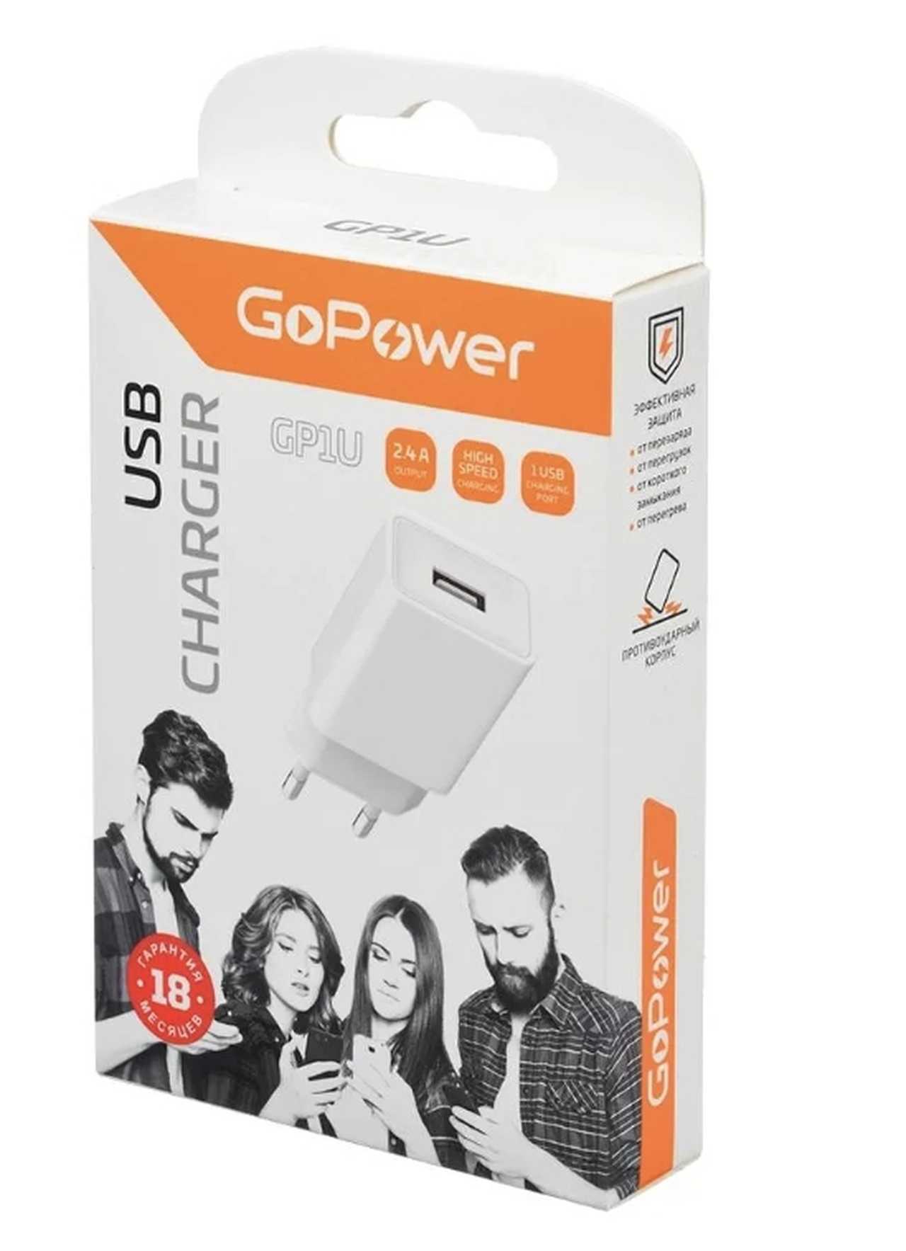 СЗУ 1хUSB 5V-2.4A GoPower GP1U + шнур type-c