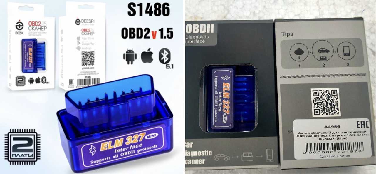 Авто-диагност OBD B02-K_S1486_A4956 версия 1.5 синий ДВЕ ПЛАТЫ ELM327 20шт/уп