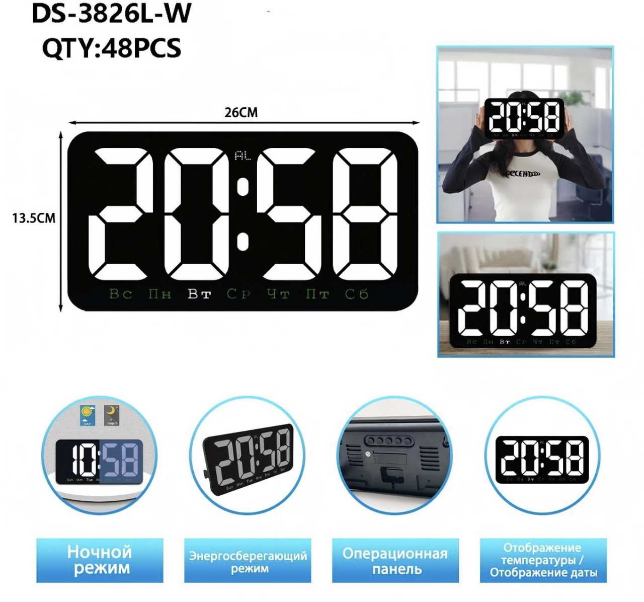 Часы+термометр+дата DS-3826L-W БЕЛые ЖИРНые цифры
