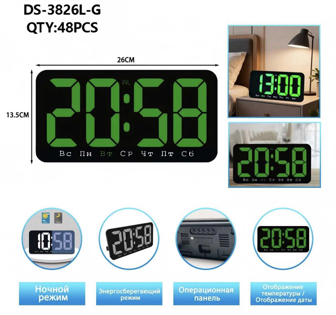 Часы+термометр+дата DS-3826L-G ЗЕЛеные ЖИРНые цифры