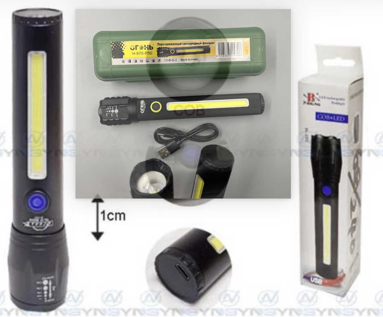Фонарь ручной АККУМ. Y-1584 LEDosl+cob сбоку + шнурокUSB ...шт/уп